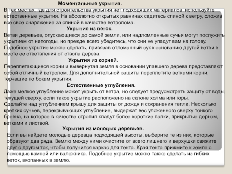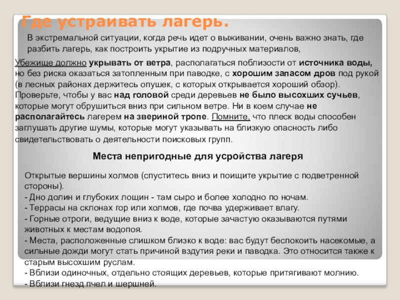 Убежище должно укрывать от ветра, располагаться поблизости от источника воды, но без риска оказаться затопленным при паводке, с хорошим запасом дров под рукой (в лесных районах держитесь опушек, с которых открывается хороший обзор). Проверьте, чтобы у вас над головой среди деревьев не было высохших сучьев, которые могут обрушиться вниз при сильном ветре. Ни в коем случае не располагайтесь лагерем на звериной тропе. Помните, что плеск воды способен заглушать другие шумы, которые могут указывать на близкую опасность либо свидетельствовать о деятельности поисковых групп.
