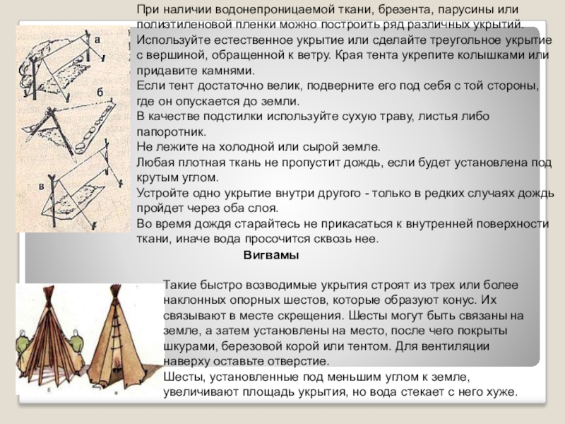 Такие быстро возводимые укрытия строят из трех или более наклонных опорных шестов, которые образуют конус. Их связывают в месте скрещения. Шесты могут быть связаны на земле, а затем установлены на место, после чего покрыты шкурами, березовой корой или тентом. Для вентиляции наверху оставьте отверстие.