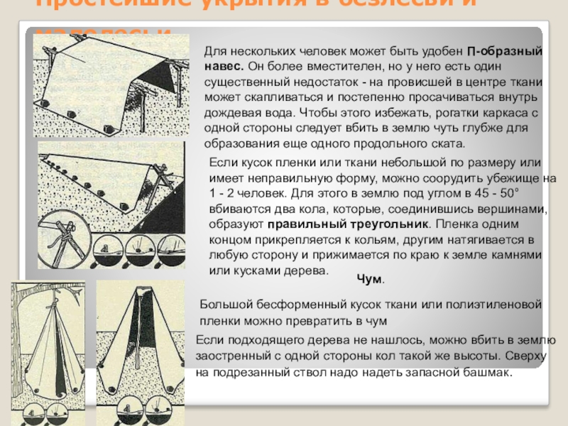 Если кусок пленки или ткани небольшой по размеру или имеет неправильную форму, можно соорудить убежище на 1 - 2 человек. Для этого в землю под углом в 45 - 50° вбиваются два кола, которые, соединившись вершинами, образуют правильный треугольник. Пленка одним концом прикрепляется к кольям, другим натягивается в любую сторону и прижимается по краю к земле камнями или кусками дерева.