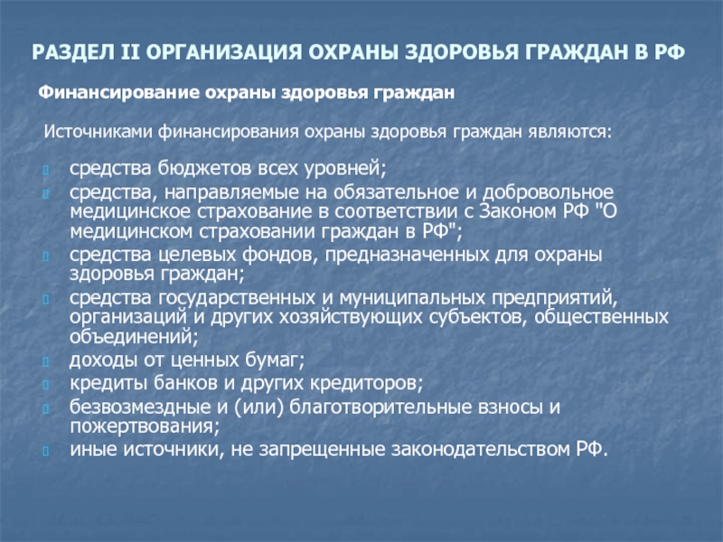 Слайд 6РАЗДЕЛ II ОРГАНИЗАЦИЯ ОХРАНЫ ЗДОРОВЬЯ ГРАЖДАН В РФ