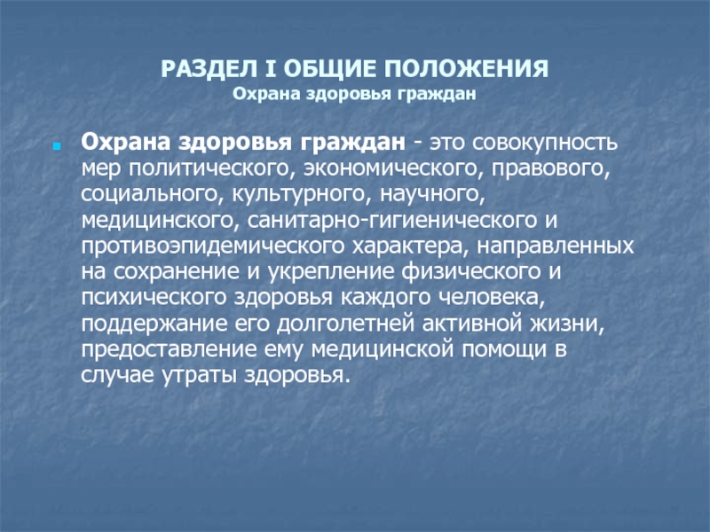 мер политического, экономического, правового, социального, культурного, научного, медицинского, санитарно-гигиенического и противоэпидемического характера, направленных на сохранение и укрепление физического и психического здоровья каждого человека, поддержание его долголетней активной жизни, предоставление ему медицинской помощи в случае утраты здоровья.