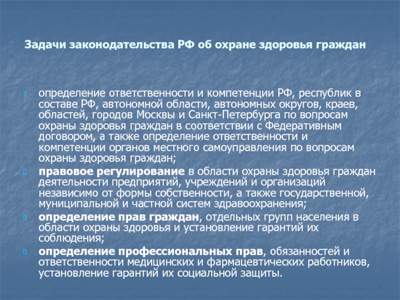 РФ, республик в составе РФ, автономной области, автономных округов, краев, областей, городов Москвы и Санкт-Петербурга по вопросам охраны здоровья граждан в соответствии с Федеративным договором, а также определение ответственности и компетенции органов местного самоуправления по вопросам охраны здоровья граждан;