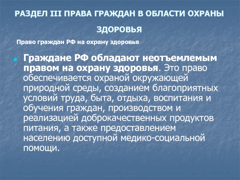 Слайд 11РАЗДЕЛ III ПРАВА ГРАЖДАН В ОБЛАСТИ ОХРАНЫ ЗДОРОВЬЯ