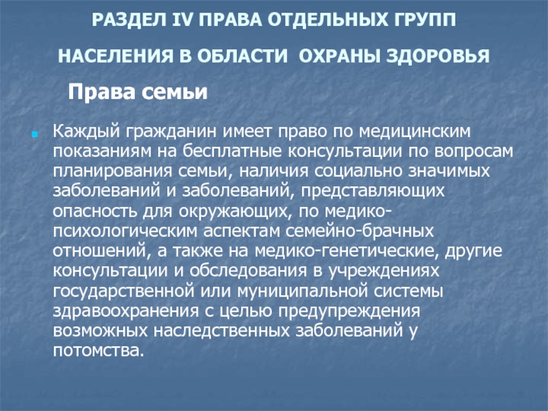 Слайд 14РАЗДЕЛ IV ПРАВА ОТДЕЛЬНЫХ ГРУПП НАСЕЛЕНИЯ В ОБЛАСТИ ОХРАНЫ ЗДОРОВЬЯ