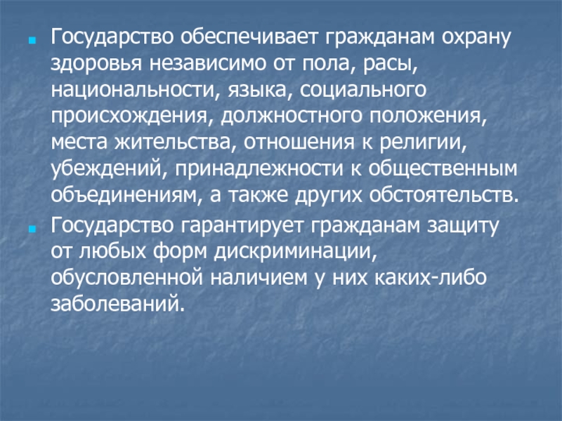 Слайд 12Государство обеспечивает гражданам охрану здоровья независимо от пола, расы, национальности, языка,