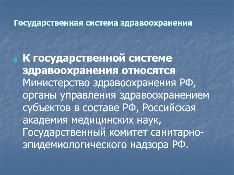 К государственной системе здравоохранения относятся Министерство здравоохранения РФ, органы