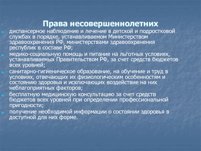 санитарно-гигиеническое образование, на обучение и труд в условиях, отвечающих их физиологическим особенностям и состоянию здоровья и исключающих воздействие на них неблагоприятных факторов;