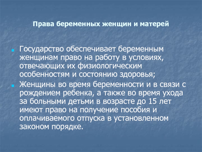 Женщины во время беременности и в связи с рождением ребенка, а также во время ухода за больными детьми в возрасте до 15 лет имеют право на получение пособия и оплачиваемого отпуска в установленном законом порядке.