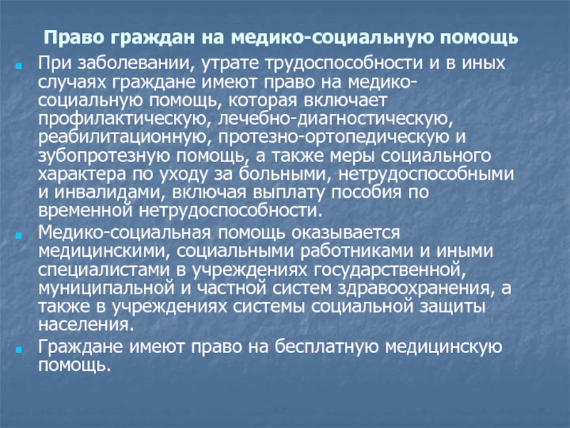 случаях граждане имеют право на медико-социальную помощь, которая включает профилактическую, лечебно-диагностическую, реабилитационную, протезно-ортопедическую и зубопротезную помощь, а также меры социального характера по уходу за больными, нетрудоспособными и инвалидами, включая выплату пособия по временной нетрудоспособности.