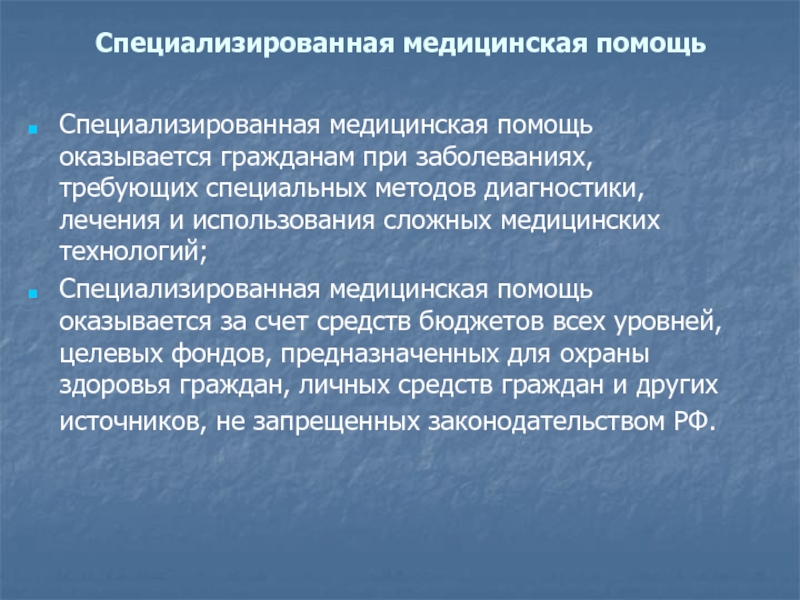 Специализированная медицинская помощь оказывается за счет средств бюджетов всех уровней, целевых фондов, предназначенных для охраны здоровья граждан, личных средств граждан и других источников, не запрещенных законодательством РФ.