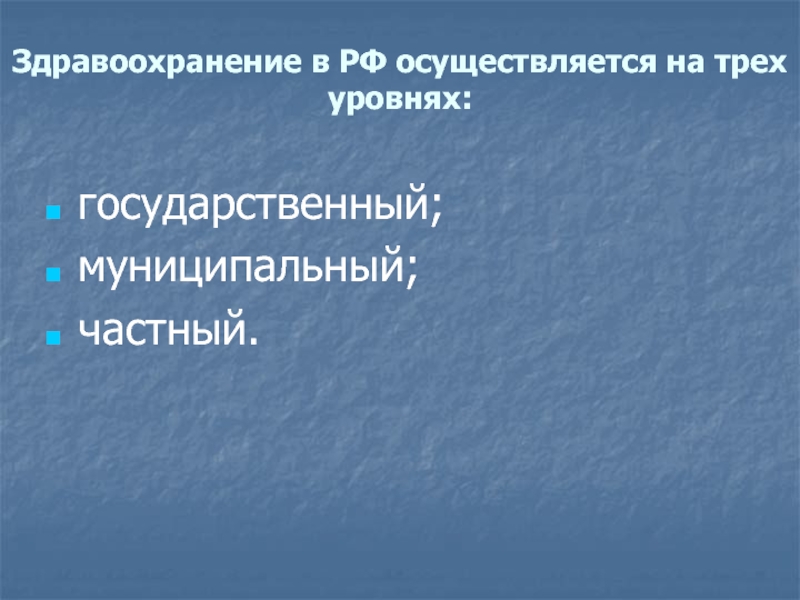 Слайд 7Здравоохранение в РФ осуществляется на трех уровнях: