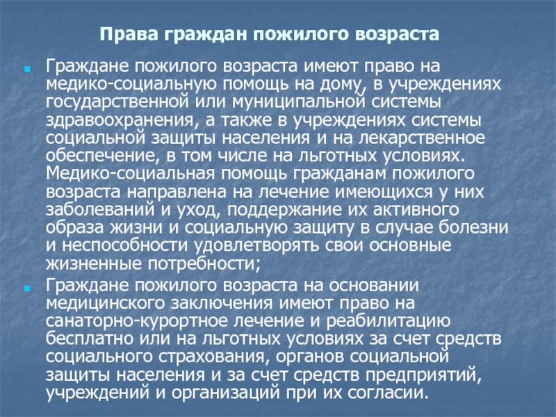 на дому, в учреждениях государственной или муниципальной системы здравоохранения, а также в учреждениях системы социальной защиты населения и на лекарственное обеспечение, в том числе на льготных условиях. Медико-социальная помощь гражданам пожилого возраста направлена на лечение имеющихся у них заболеваний и уход, поддержание их активного образа жизни и социальную защиту в случае болезни и неспособности удовлетворять свои основные жизненные потребности;