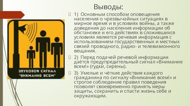 3) Умелые и чёткие действия каждого гражданина по сигналу «Внимание всем!» и строгое соблюдение правил поведения позволят своевременно принять меры защиты, сохранить и спасти жизнь себе и окружающим.