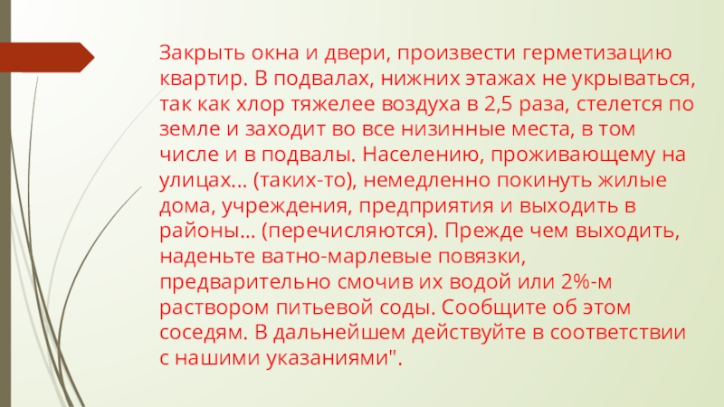 не укрываться, так как хлор тяжелее воздуха в 2,5 раза, стелется по земле и заходит во все низинные места, в том числе и в подвалы. Населению, проживающему на улицах... (таких-то), немедленно покинуть жилые дома, учреждения, предприятия и выходить в районы... (перечисляются). Прежде чем выходить, наденьте ватно-марлевые повязки, предварительно смочив их водой или 2%-м раствором питьевой соды. Сообщите об этом соседям. В дальнейшем действуйте в соответствии с нашими указаниями".