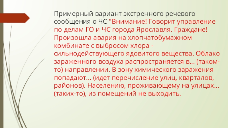 делам ГО и ЧС города Ярославля. Граждане! Произошла авария на хлопчатобумажном комбинате с выбросом хлора - сильнодействующего ядовитого вещества. Облако зараженного воздуха распространяется в... (таком-то) направлении. В зону химического заражения попадают... (идет перечисление улиц, кварталов, районов). Населению, проживающему на улицах... (таких-то), из помещений не выходить.