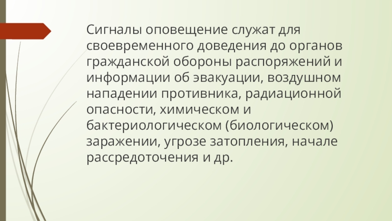 Слайд 13Сигналы оповещение служат для своевременного доведения до органов гражданской обороны распоряжений