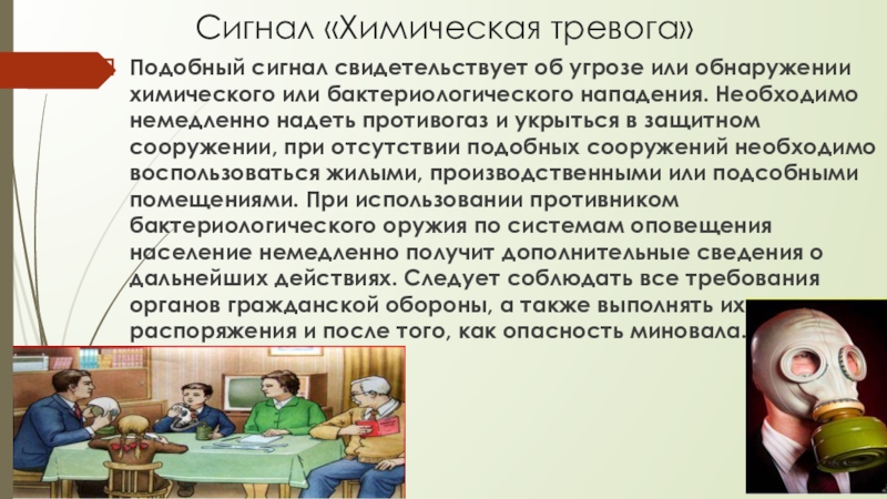 к которым движется радиоактивное облако, образовавшееся при взрыве ядерного боеприпаса. Услышав данный сигнал, необходимо срочно надеть респиратор, ватно-марлевую повязку, при их отсутствии надеть противогаз. Собрать заготовленный заранее запас продуктов, индивидуальные средства медицинской защиты, предметы первой необходимости и спрятаться в противорадиационное убежище.