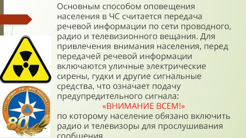 Слайд 12Основным способом оповещения населения в ЧС считается передача речевой информации по