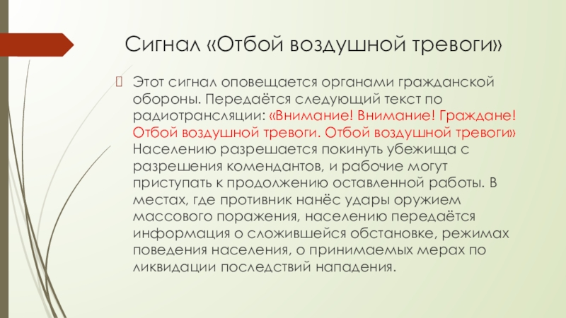 Слайд 8Сигнал «Отбой воздушной тревоги»