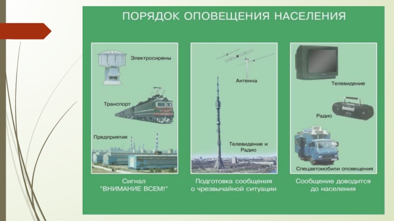 сети проводного, радио и телевизионного вещания. Для привлечения внимания населения, перед передачей речевой информации включаются уличные электрические сирены, гудки и другие сигнальные средства, что означает подачу предупредительного сигнала:
