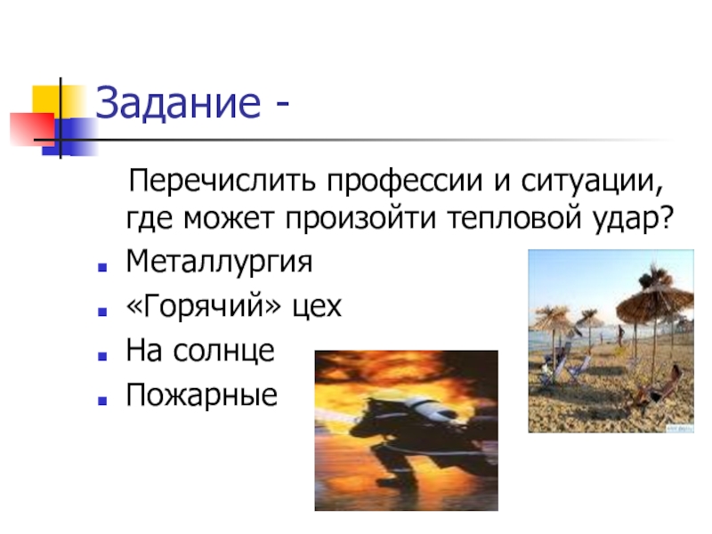 Задание -  Перечислить профессии и ситуации, где может произойти тепловой удар?Металлургия«Горячий» цехНа солнцеПожарные