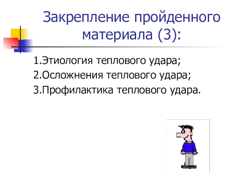 Закрепление пройденного материала (3):1.Этиология теплового удара;2.Осложнения теплового удара;3.Профилактика теплового удара.
