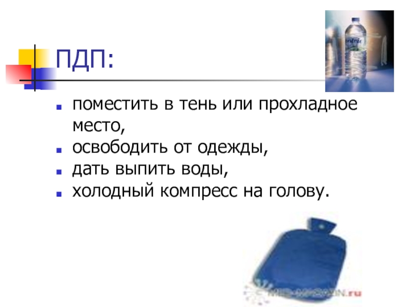 ПДП:поместить в тень или прохладное место, освободить от одежды, дать выпить воды, холодный компресс на голову.