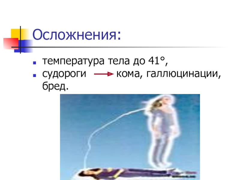 Осложнения:температура тела до 41°,судороги     кома, галлюцинации, бред.