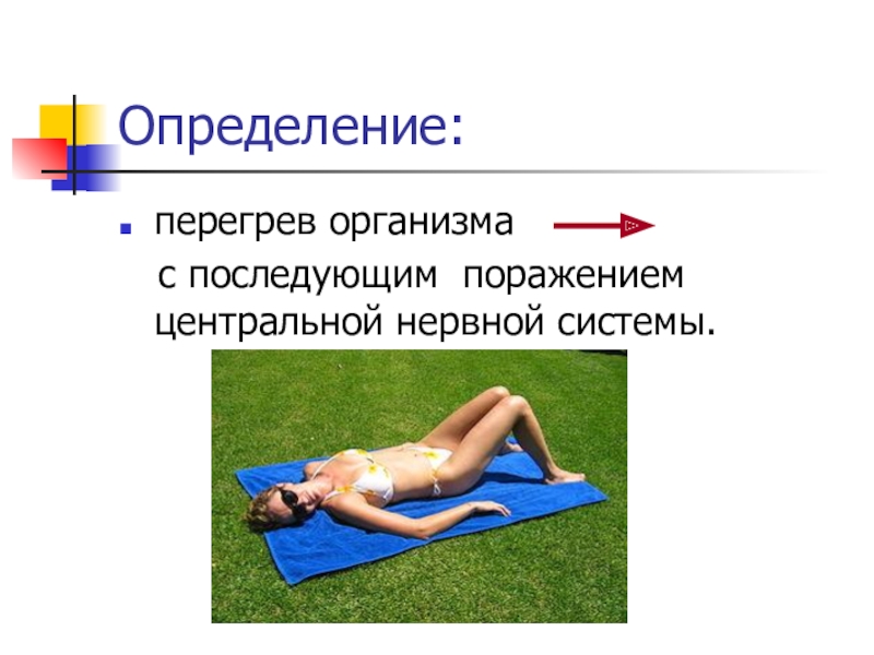 Определение:перегрев организма         с последующим поражением центральной нервной системы.