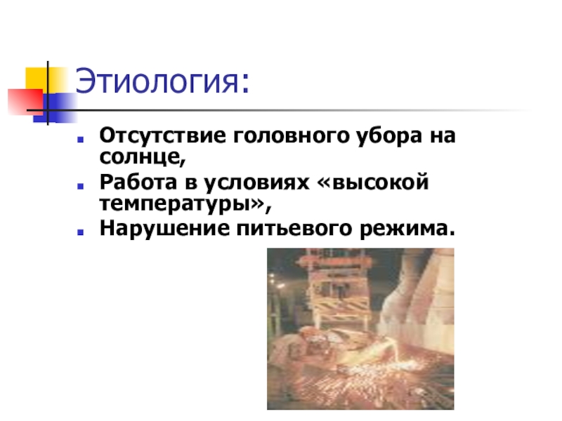 Этиология:Отсутствие головного убора на солнце,Работа в условиях «высокой температуры»,Нарушение питьевого режима.