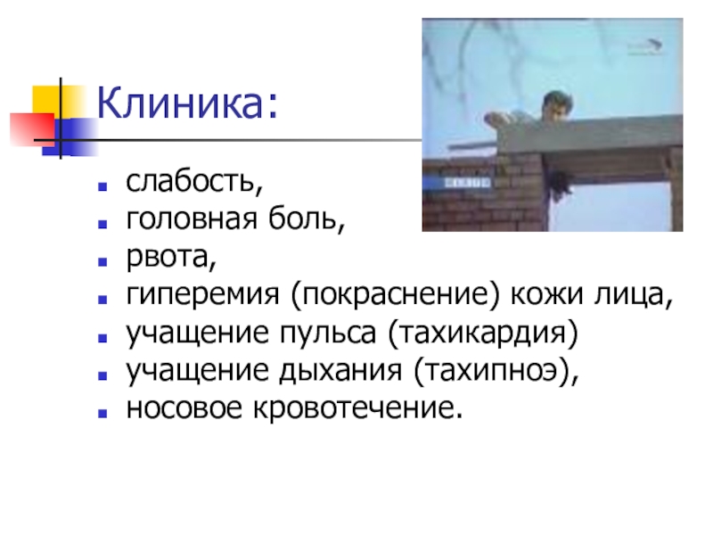 Клиника:слабость,головная боль, рвота, гиперемия (покраснение) кожи лица,учащение пульса (тахикардия) учащение дыхания (тахипноэ),  носовое кровотечение.