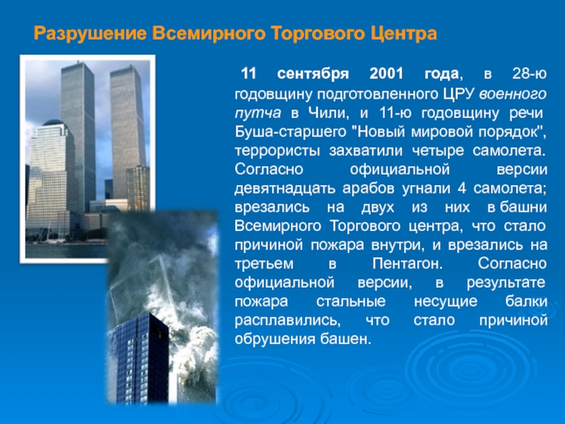 ЦРУ военного путча в Чили, и 11-ю годовщину речи Буша-старшего "Новый мировой порядок", террористы захватили четыре самолета. Согласно официальной версии девятнадцать арабов угнали 4 самолета; врезались на двух из них в башни Всемирного Торгового центра, что стало причиной пожара внутри, и врезались на третьем в Пентагон. Согласно официальной версии, в результате пожара стальные несущие балки расплавились, что стало причиной обрушения башен.