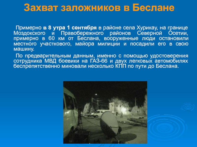 села Хурикау, на границе Моздокского и Правобережного районов Северной Осетии, примерно в 60 км от Беслана, вооруженные люди остановили местного участкового, майора милиции и посадили его в свою машину.