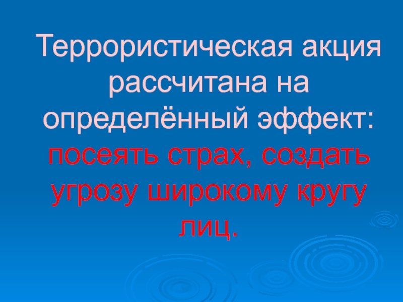 Слайд 5Террористическая акция рассчитана на определённый эффект: посеять страх, создать угрозу широкому