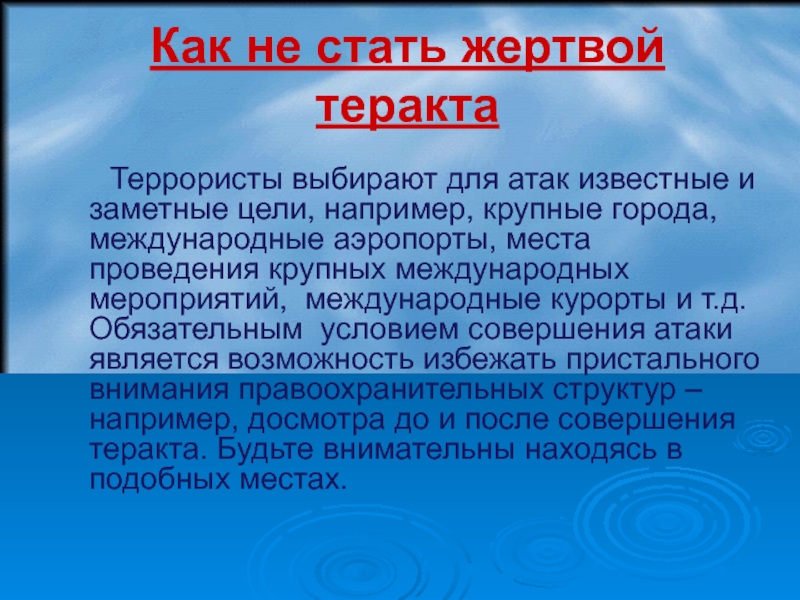 выбирают для атак известные и заметные цели, например, крупные города, международные аэропорты, места проведения крупных международных мероприятий, международные курорты и т.д. Обязательным условием совершения атаки является возможность избежать пристального внимания правоохранительных структур – например, досмотра до и после совершения теракта. Будьте внимательны находясь в подобных местах.