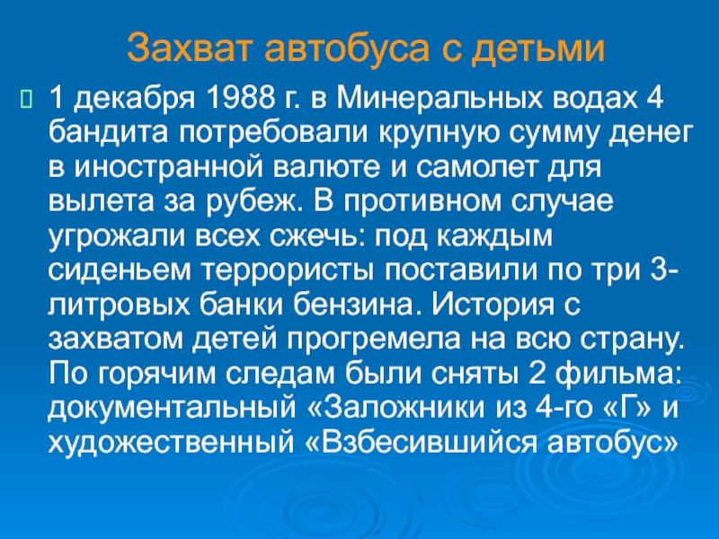 бандита потребовали крупную сумму денег в иностранной валюте и самолет для вылета за рубеж. В противном случае угрожали всех сжечь: под каждым сиденьем террористы поставили по три 3-литровых банки бензина. История с захватом детей прогремела на всю страну. По горячим следам были сняты 2 фильма: документальный «Заложники из 4-го «Г» и художественный «Взбесившийся автобус»