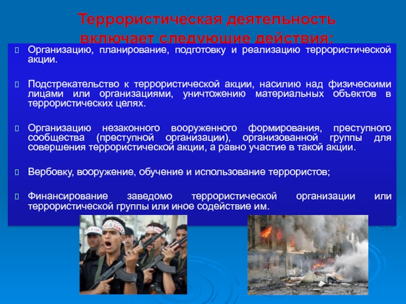 Слайд 4Терроризм – акции, сопряженные с применением насилия или угрозой насилия, сопровождаемые
