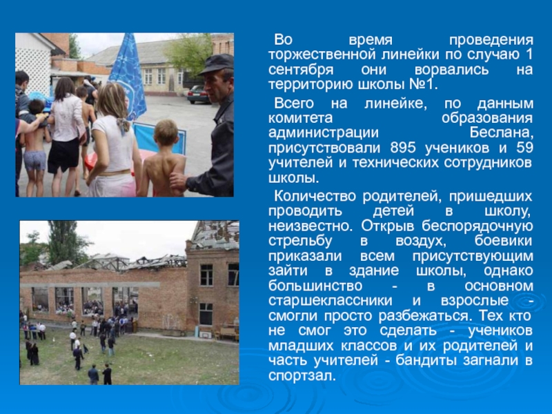 Слайд 16 В первые же минуты захвата на звуки выстрелов к школе начали