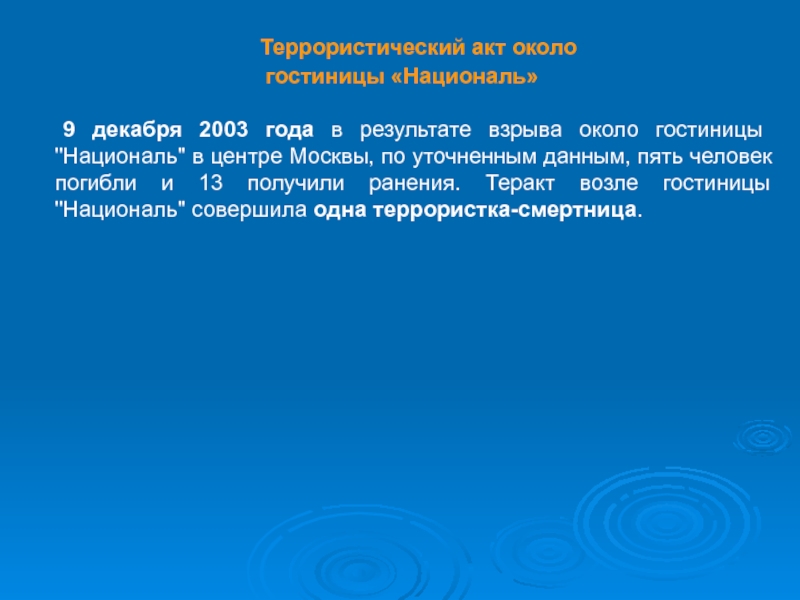 около гостиницы "Националь" в центре Москвы, по уточненным данным, пять человек погибли и 13 получили ранения. Теракт возле гостиницы "Националь" совершила одна террористка-смертница.