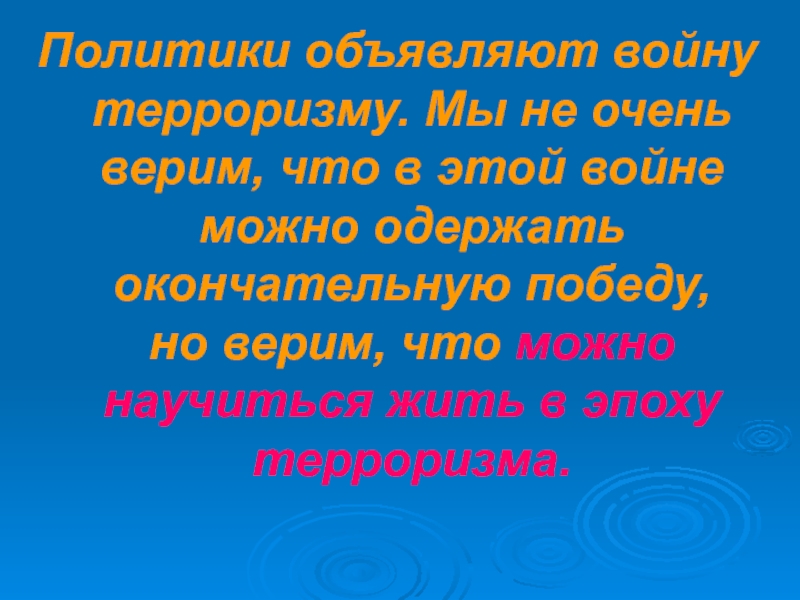 Слайд 23Политики объявляют войну терроризму. Мы не очень верим, что в этой войне можно одержать