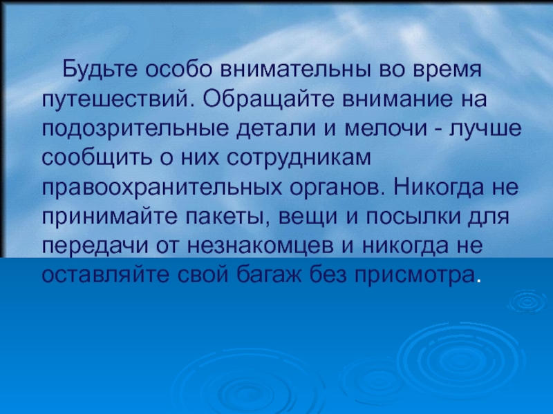 путешествий. Обращайте внимание на подозрительные детали и мелочи - лучше сообщить о них сотрудникам правоохранительных органов. Никогда не принимайте пакеты, вещи и посылки для передачи от незнакомцев и никогда не оставляйте свой багаж без присмотра.