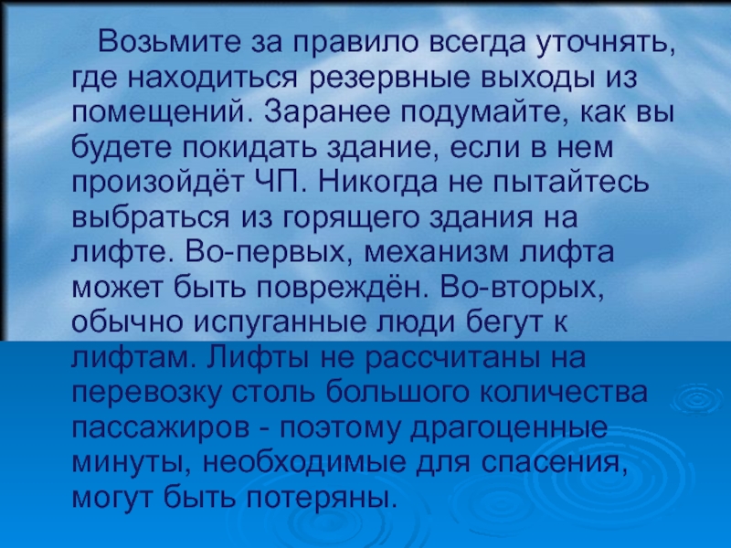 выходы из помещений. Заранее подумайте, как вы будете покидать здание, если в нем произойдёт ЧП. Никогда не пытайтесь выбраться из горящего здания на лифте. Во-первых, механизм лифта может быть повреждён. Во-вторых, обычно испуганные люди бегут к лифтам. Лифты не рассчитаны на перевозку столь большого количества пассажиров - поэтому драгоценные минуты, необходимые для спасения, могут быть потеряны.