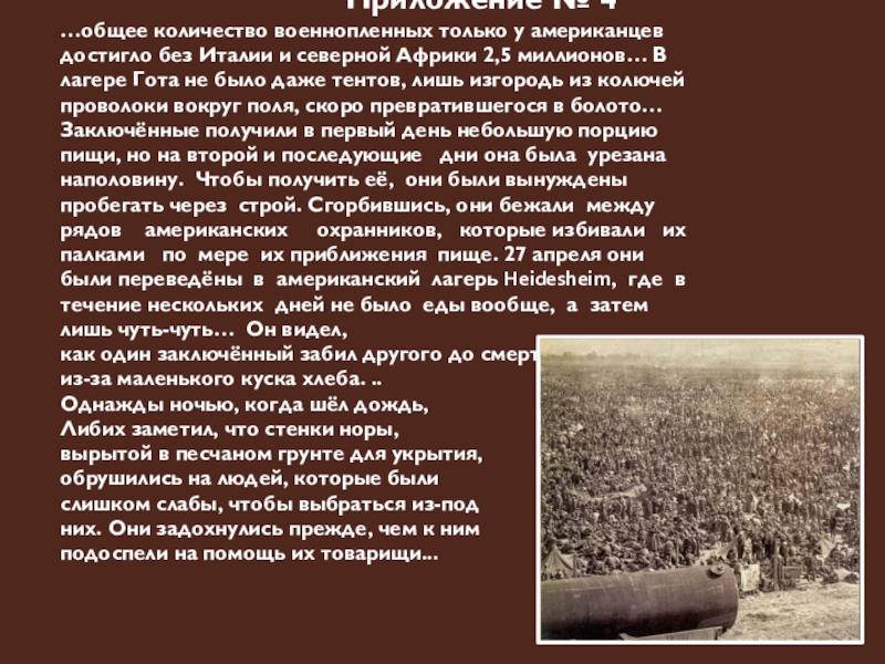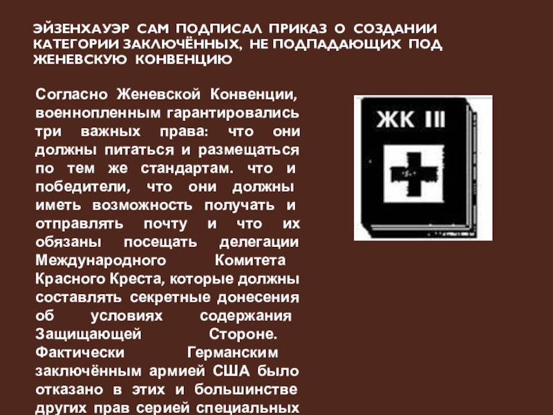 Согласно Женевской Конвенции, военнопленным гарантировались три важных права: что они должны питаться и размещаться по тем же стандартам. что и победители, что они должны иметь возможность получать и отправлять почту и что их обязаны посещать делегации Международного Комитета Красного Креста, которые должны составлять секретные донесения об условиях содержания Защищающей Стороне. Фактически Германским заключённым армией США было отказано в этих и большинстве других прав серией специальных решений и директив