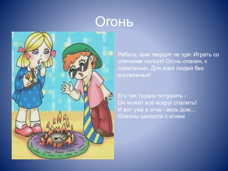 Ребята, вам твердят не зря: Играть со спичками нельзя! Огонь опасен,