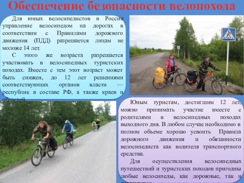 Юным туристам, достигшим 12 лет, можно принимать участие вместе с родителями в велосипедных походах выходного дня. В любом случае необходимо в полном объеме хорошо усвоить Правила дорожного движения и обязанности велосипедиста как водителя транспортного средства.