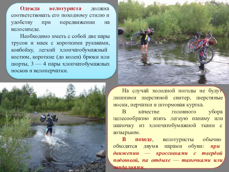 В походе, велотуристы обычно обходятся двумя парами обуви: при движении — кроссовками с твердой подошвой, на отдыхе — тапочками или сандалиями.