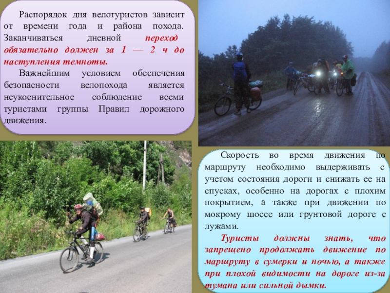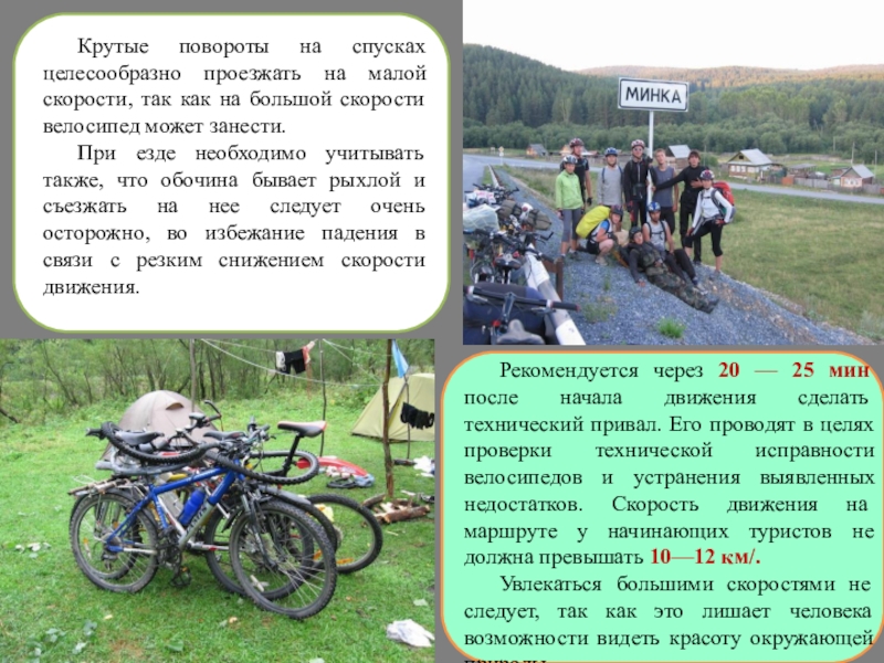 Рекомендуется через 20 — 25 мин после начала движения сделать технический привал. Его проводят в целях проверки технической исправности велосипедов и устранения выявленных недостатков. Скорость движения на маршруте у начинающих туристов не должна превышать 10—12 км/.