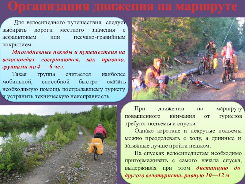 На спусках велосипедистам необходимо притормаживать с самого начала спуска, выдерживая при этом дистанцию до другого велотуриста, равную 10—12 м