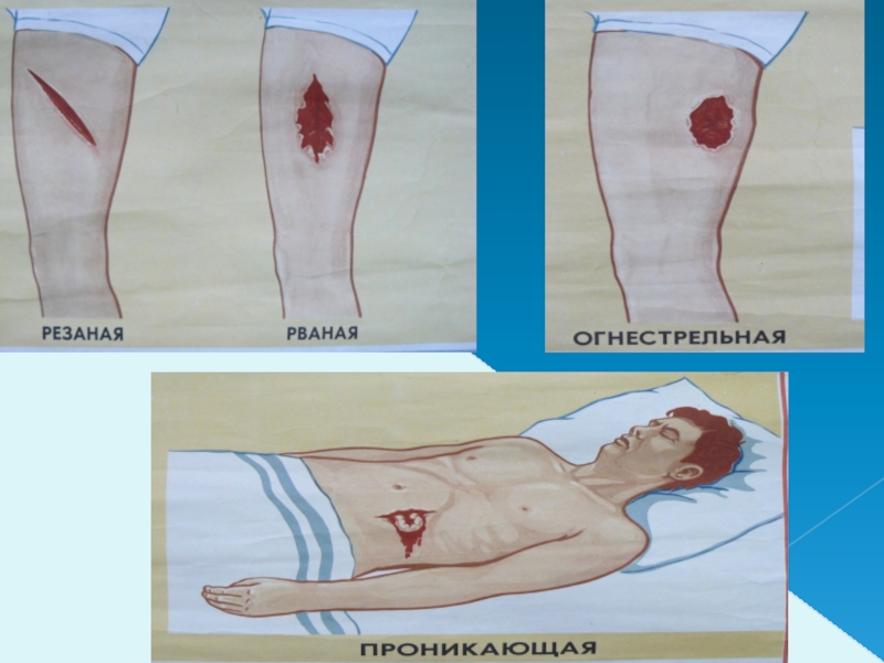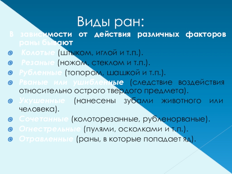 Виды ран:В зависимости от действия различных факторов раны бывают Колотые (штыком, иглой и т.п.). Резаные (ножом, стеклом и т.п.).Рубленные (топором, шашкой и т.п.).Рваные или ушибленные (следствие воздействия относительно острого твердого предмета).Укушенные (нанесены зубами животного или человека).Сочетанные
