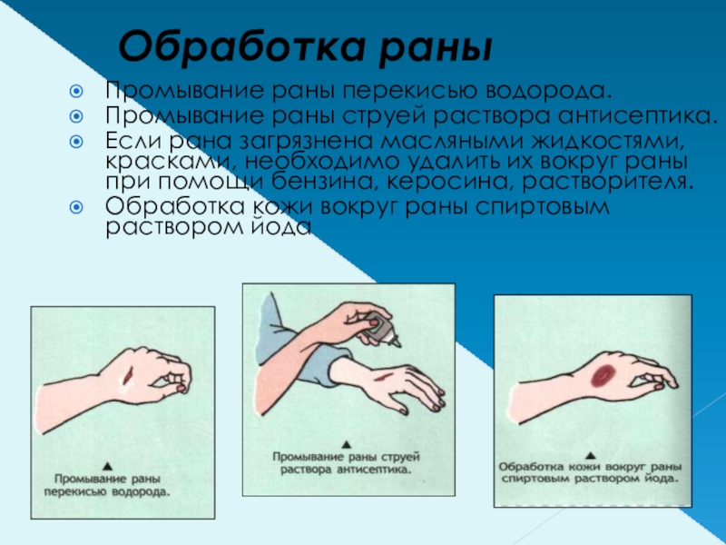 Обработка раныПромывание раны перекисью водорода.Промывание раны струей раствора антисептика.Если рана загрязнена масляными жидкостями, красками, необходимо удалить их